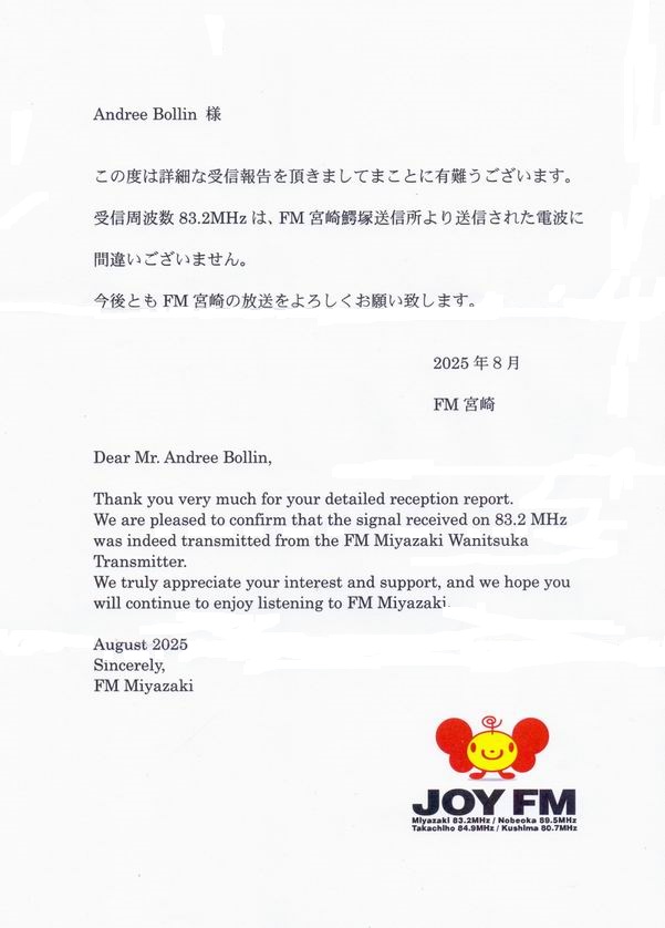 Joy FM, FM Miyazake Wanitsuka, JOMU-FM, 83.2MHz Miyazaki